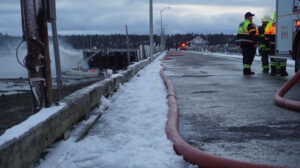 Around 3:10 p.m., firefighters were seen arriving on scene. Due to a weight restriction on the wharf approach, fire trucks are unable to drive down the length of the wharf. Firefighters were seen by reporters hauling the fire hose to the end of the structure.